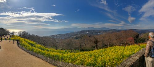 JR二宮駅から徒歩5分歩で、吾妻山公園へと続く心臓破りの階段が。途中休み休みで、136メートルの頂上へたどり着く。iPhoneXのパノラマ機能で撮影。 なかなかダイナミックに撮れる。 なかなか雲が晴れずにいたが、日が差すと、一段と菜の花の黄色が映える。こ…